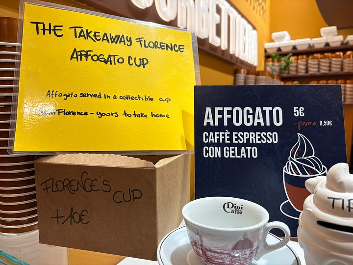 The La Sorbettiera I first knew in Piazza Tasso was so small you didn’t enter it, but instead viewed the modest number of flavors from the street. There were no crepes, sgropino, affogato, brioche, or frappe, but times they are a changing, and La Sorbettiera’s latest offering is “The Take Away Florence Affogato Cup”. Gelato with a shot of espresso served in a collectible cup that’s yours to take home.