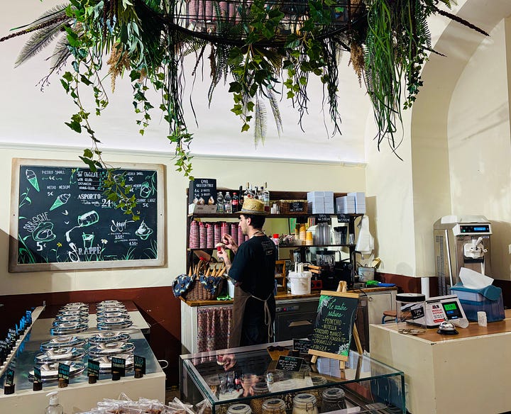 Sbrino was begun in 2018 by two couples and now is run by just one of the couples, Giusi Laganga and Ario Meli. They opened their first shop on Via dei Serragli, near Piazza Santo Spirito where their lab is also located, followed by a smaller one on Via Senese near the Porta Romana. Then came two more—one in San Niccolò eighteen months ago, and this year in my neighborhood near the Porta di San Frediano.